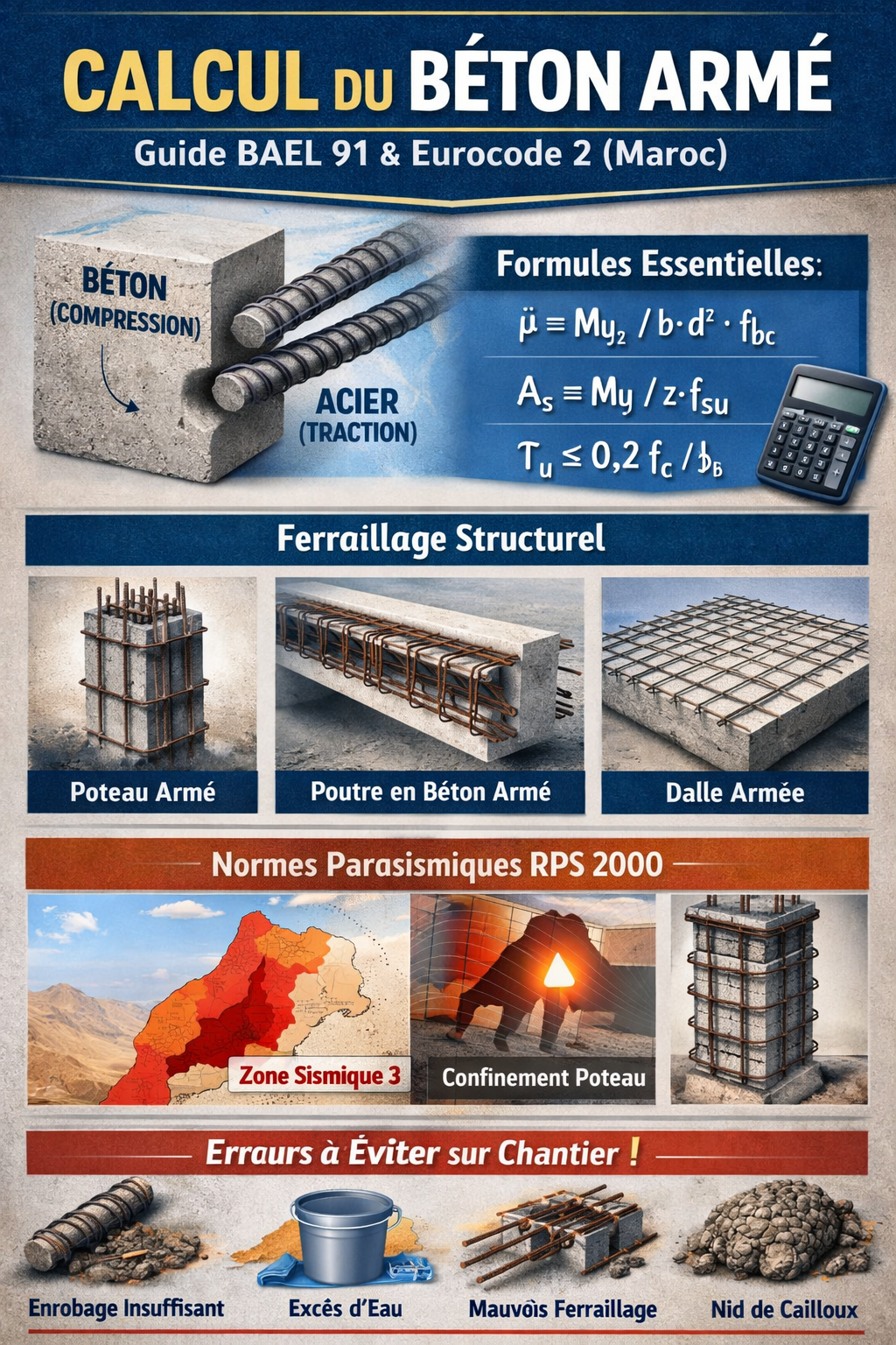 Le calcul du béton armé est le cœur de tout projet de génie civil. Que vous soyez ingénieur structure, conducteur de travaux ou technicien BTP, maîtriser les règles de ferraillage selon les normes BAEL et Eurocode 2 est indispensable pour garantir la solidité, la durabilité et la conformité de vos ouvrages au Maroc.