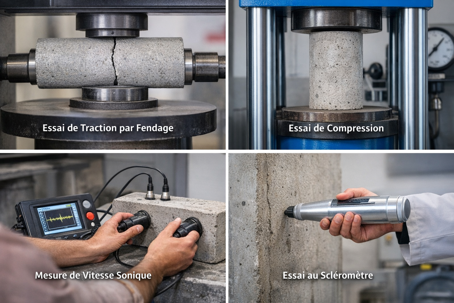Cet essai non destructif consiste à mesurer la vitesse de propagation des ondes ultrasoniques dans le béton afin d’évaluer sa compacité et détecter d’éventuels défauts internes.
